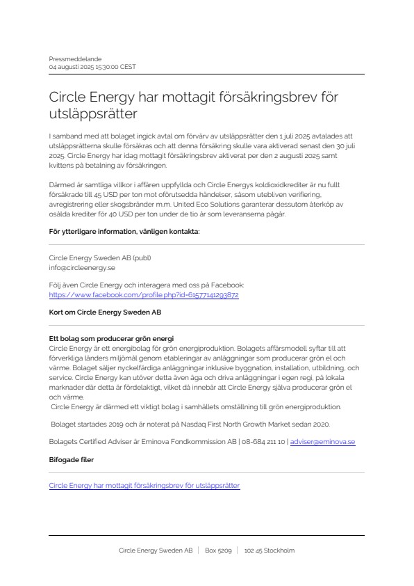 I samband med att bolaget ingick avtal om förvärv av utsläppsrätter den 1 juli 2025 avtalades att utsläppsrätterna skulle försäkras och att denna försäkring skulle vara aktiverad senast den 30 juli 2025. Circle Energy har idag mottagit försäkringsbrev aktiverat per den 2 augusti 2025 samt kvittens på betalning av försäkringen.