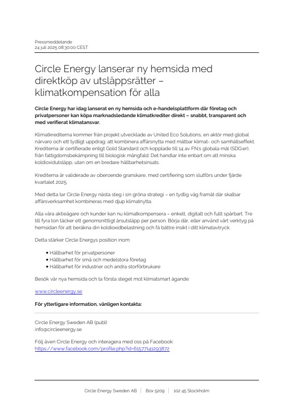 Circle Energy har idag lanserat en ny hemsida och e-handelsplattform där företag och privatpersoner kan köpa marknadsledande klimatkrediter direkt – snabbt, transparent och med verifierat klimatansvar.