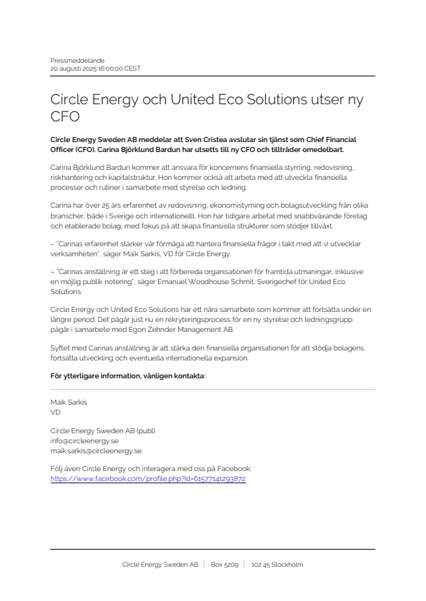 Circle Energy Sweden AB meddelar att Sven Cristea avslutar sin tjänst som Chief Financial Officer (CFO). Carina Björklund Bardun har utsetts till ny CFO och tillträder omedelbart.
