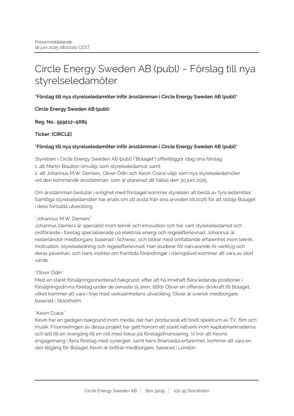 *Förslag till nya styrelseledamöter inför årsstämman i Circle Energy Sweden AB (publ)*