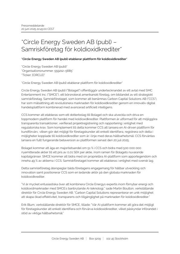 Circle Energy Sweden AB (publ) (”Bolaget”) offentliggör undertecknandet av ett avtal med SMC Entertainment Inc. (”SMCE”), ett börsnoterat amerikanskt företag, om bildandet av ett strategiskt samriskföretag. Samriskföretaget, som kommer att benämnas Carbon Capital Solutions AB (”CCS”), har som målsättning att revolutionera marknaden för koldioxidkrediter genom en innovativ digital handelsplattform kombinerad med avancerad artificiell intelligens.