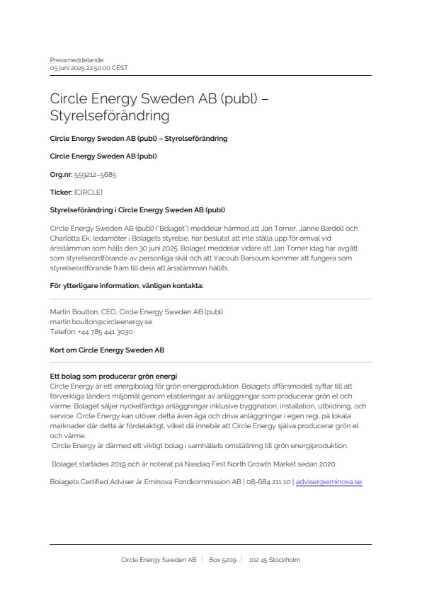 Circle Energy Sweden AB (publ) (“Bolaget”) meddelar härmed att Jan Torner, Janne Bardell och Charlotta Ek, ledamöter i Bolagets styrelse, har beslutat att inte ställa upp för omval vid årsstämman som hålls den 30 juni 2025. Bolaget meddelar vidare att Jan Torner idag har avgått som styrelseordförande av personliga skäl och att Yacoub Barsoum kommer att fungera som styrelseordförande fram till dess att årsstämman hållits.