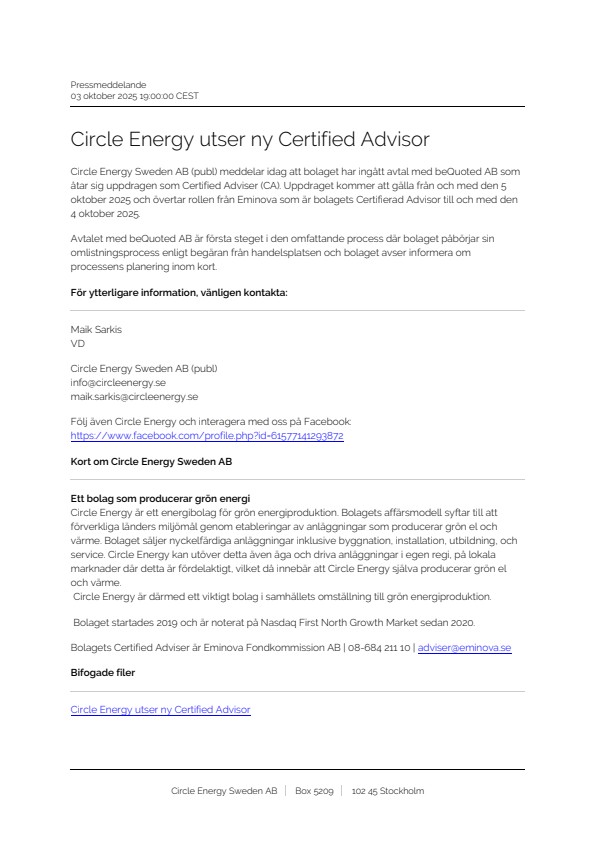 Circle Energy Sweden AB (publ) meddelar idag att bolaget har ingått avtal med beQuoted AB som åtar sig uppdragen som Certified Adviser (CA). Uppdraget kommer att gälla från och med den 5 oktober 2025 och övertar rollen från Eminova som är bolagets Certifierad Advisor till och med den 4 oktober 2025.