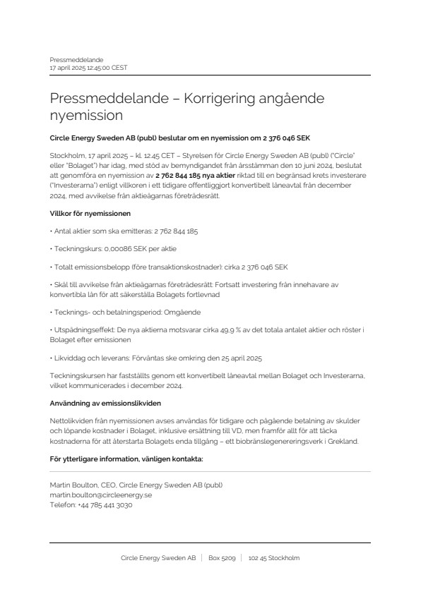 Stockholm, 17 april 2025 – kl. 12.45 CET – Styrelsen för Circle Energy Sweden AB (publ) (“Circle” eller “Bolaget”) har idag, med stöd av bemyndigandet från årsstämman den 10 juni 2024, beslutat att genomföra en nyemission av 2 762 844 185 nya aktier riktad till en begränsad krets investerare (“Investerarna”) enligt villkoren i ett tidigare offentliggjort konvertibelt låneavtal från december 2024, med avvikelse från aktieägarnas företrädesrätt.
