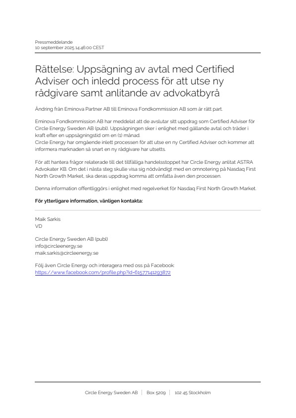 Eminova Fondkommission AB har meddelat att de avslutar sitt uppdrag som Certified Adviser för Circle Energy Sweden AB (publ). Uppsägningen sker i enlighet med gällande avtal och träder i kraft efter en uppsägningstid om en (1) månad.