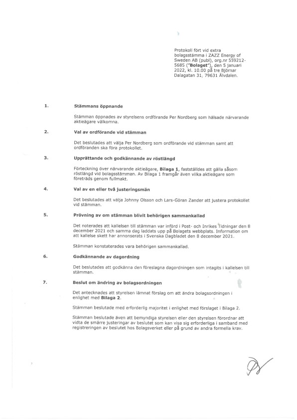 Stämmoprotokoll Stämmoprotokoll från extra bolagsstämma den 5 januari. Dokument: Protokoll extra stämma 2022-01-05 Zazz Energy Protokoll extra stämma 2022-01-05 Zazz Energy