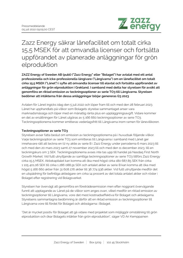ZAZZ Energy of Sweden AB (publ) (”Zazz Energy” eller ”Bolaget”) har avtalat med ett antal professionella och icke-professionella långivare (”Långivarna”) om en lånefacilitet om totalt cirka 15,5 MSEK (”Lånet”) i syfte att omvandla licenser till elavtal och fortsätta uppförandet av anläggningar för grön elproduktion i Grekland. I samband med detta har styrelsen för avsikt att genomföra en riktad emission av teckningsoptioner av serie TO3 till Långivarna. Styrelsen bedömer att intäkterna från dessa anläggningar börjar genereras Q3 2023